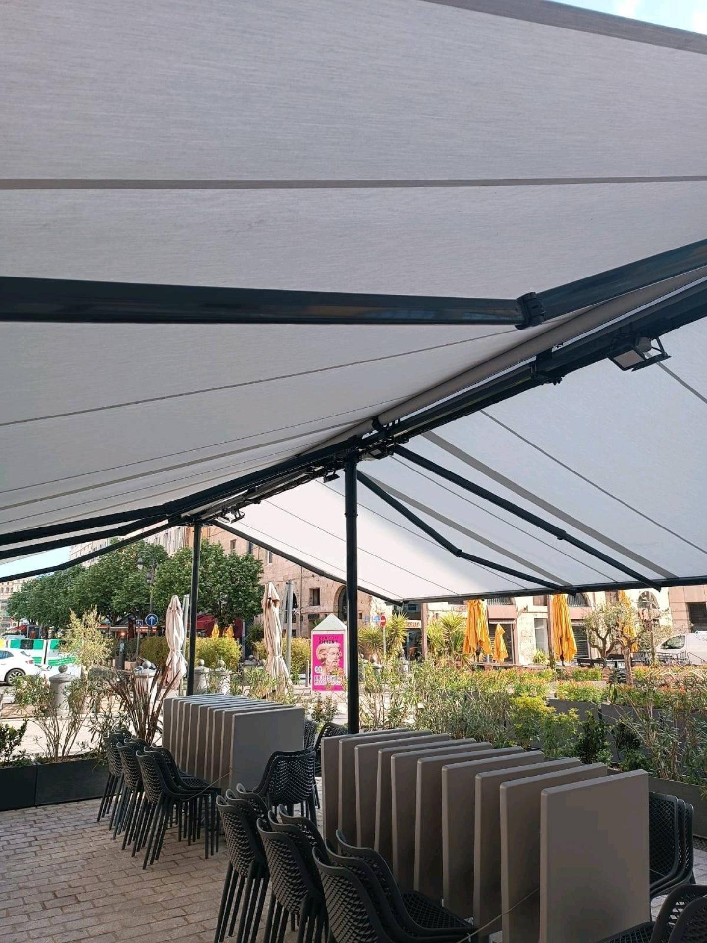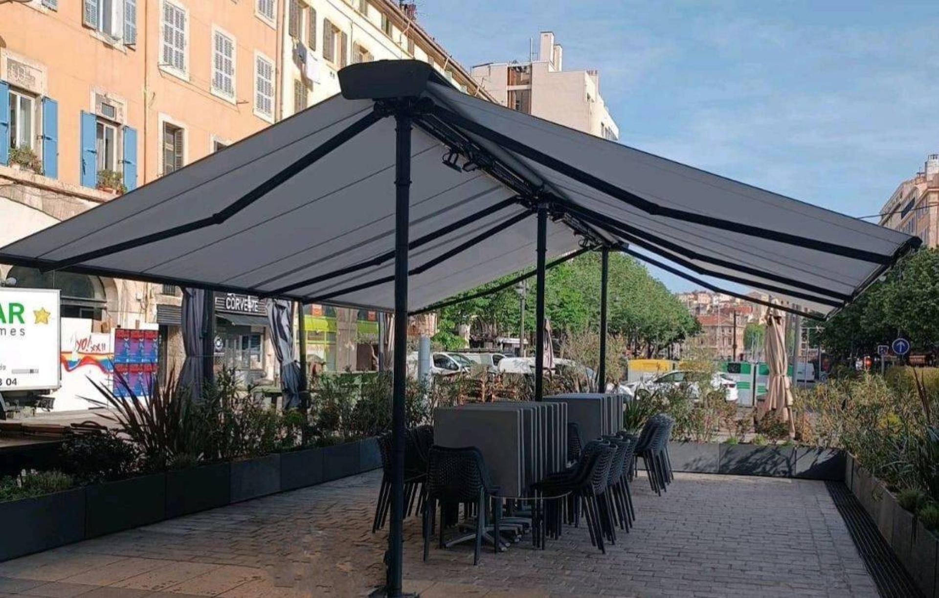 Cafés, brasseries, hôtels et restaurants de la région nous font confiance pour protéger leurs clients du soleil, grâce à nos stores bannes, stores de terrasse double pente sur pieds et nos parasols professionnels grandes dimensions, ou encore pour optimiser leur terrasse en toute saison grâce à l'installation d'une pergola bioclimatique à lames orientables ou d'un vélum (pergola à toile rétractable)en guise de salle supplémentaire.. Vous aussi, consultez nous pour l'étude personnalisée de votre projet.