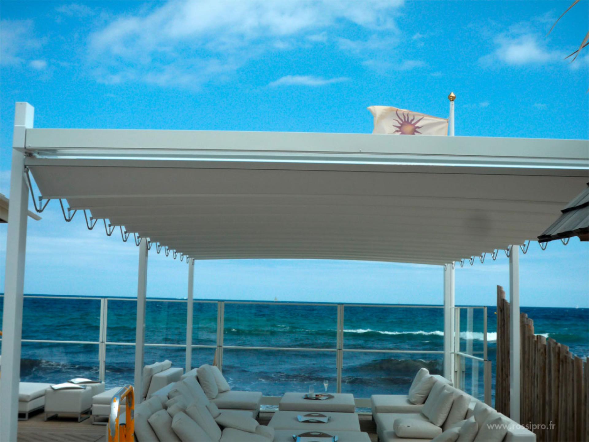 Cette fois c'est le restaurant et plage privé Manoah-Beach à Saint-Tropez qui nous a retenus pour l'installation d'une pergola VELUM, structure autoporteuse en aluminium verni.