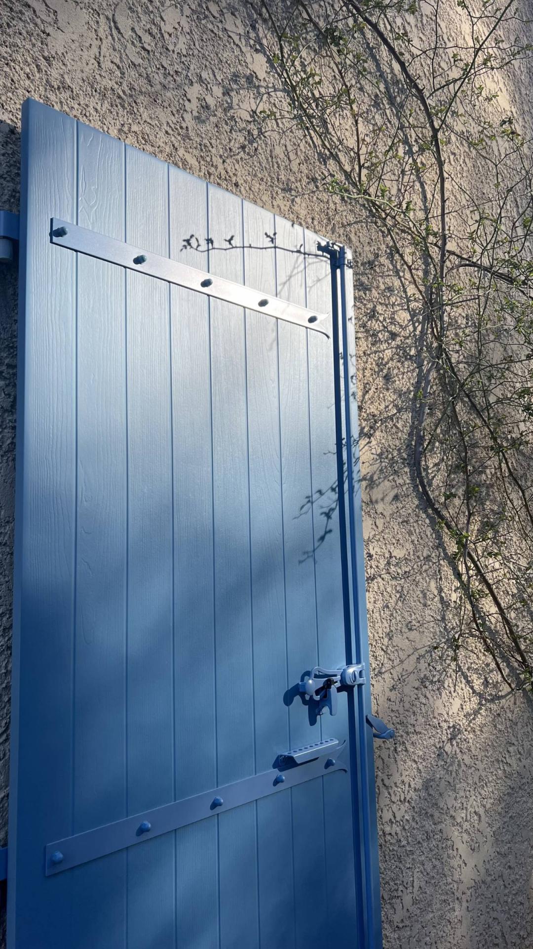 Au total, ce sont 9 fenêtres qui ont été habillées avec ces volets battants : 7 possédants deux vantaux et 2 avec vantail unique. Parmi les plus de 4000 coloris disponibles, le choix s’est ici porté sur le bleu pastel (RAL 5024) mettant en valeur la maison. Quant à la forme des pentures, c’est celle en queue de carpe qui a été retenue.