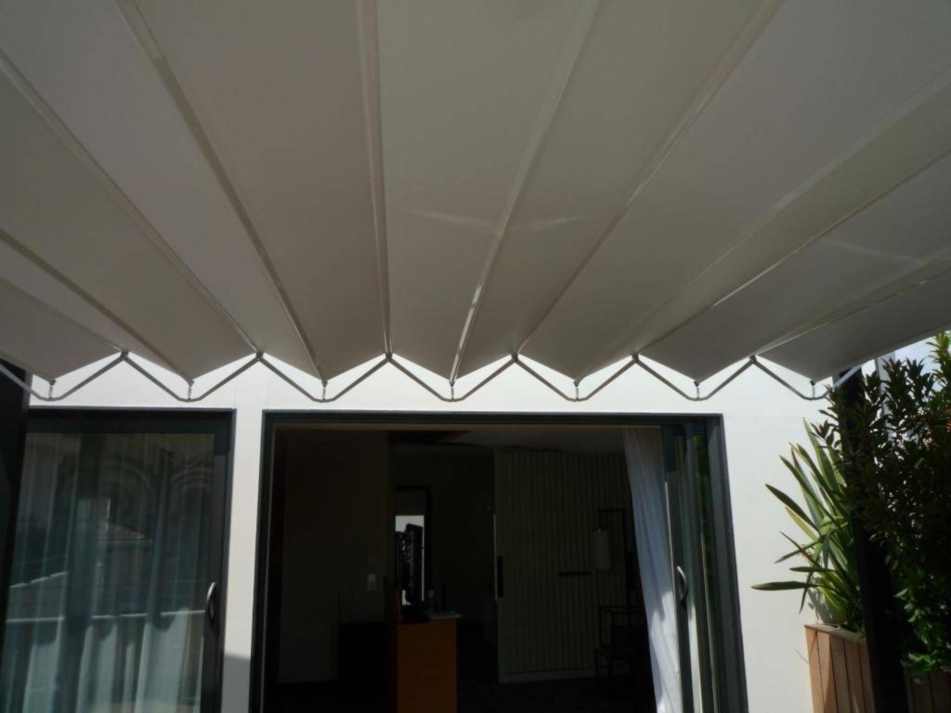 pergola aluminium à toile rétractable étanche avec pantographes. Le mécanisme breveté de la couverture repliable en plis de vague est articulé grâce au système de pantographes (tiges en acier) motorisés qui font coulisser la toile PVC étanche pour ouvrir ou refermer totalement la structure. Ainsi,