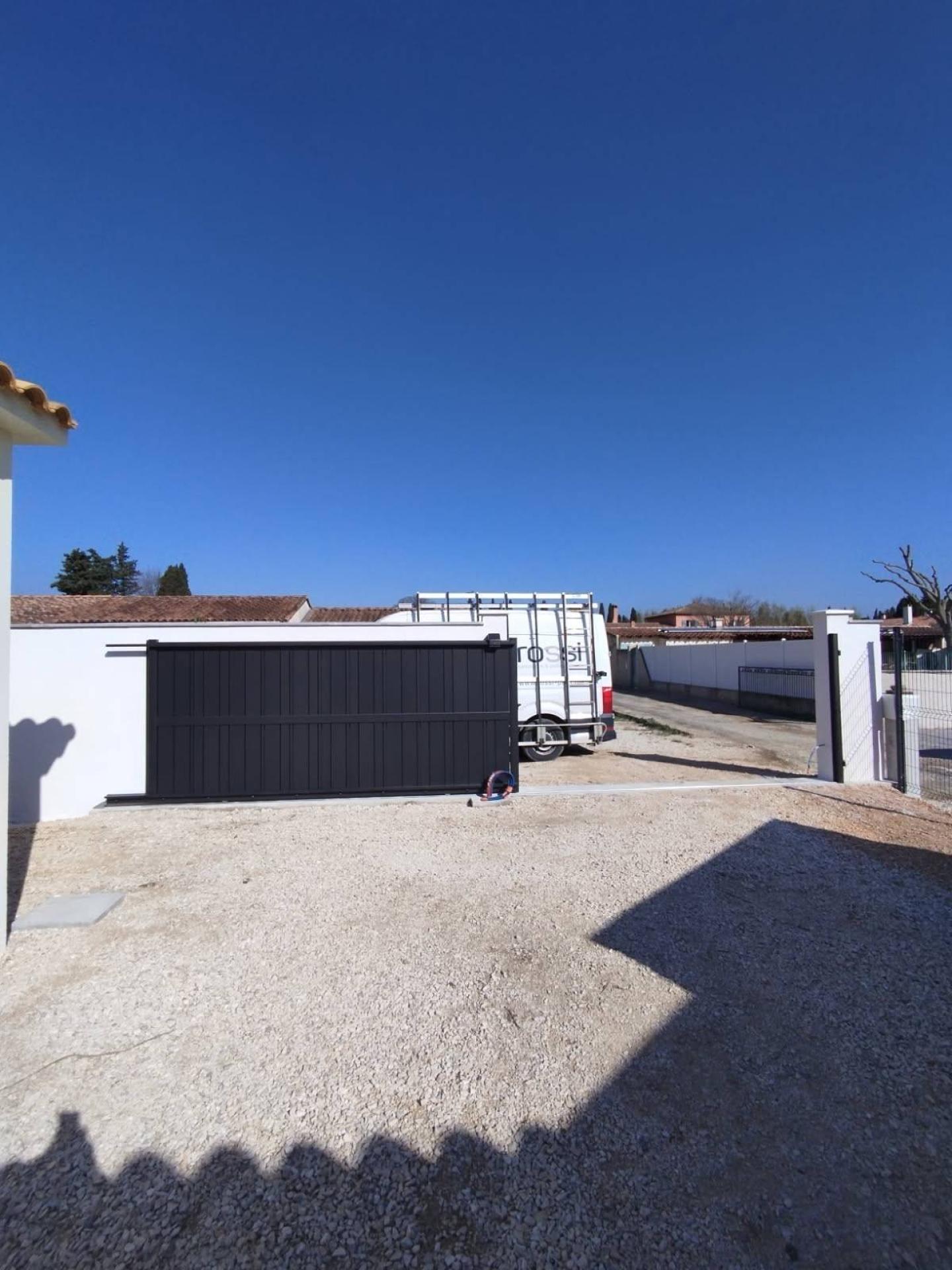 L’installation s’est faite en coordination avec les aménagements extérieurs de la maison. Le rail au sol a été mis en place avec précision pour garantir un coulissement fluide du portail. La structure robuste et la qualité de fabrication KOSTUM assurent une excellente tenue dans le temps.