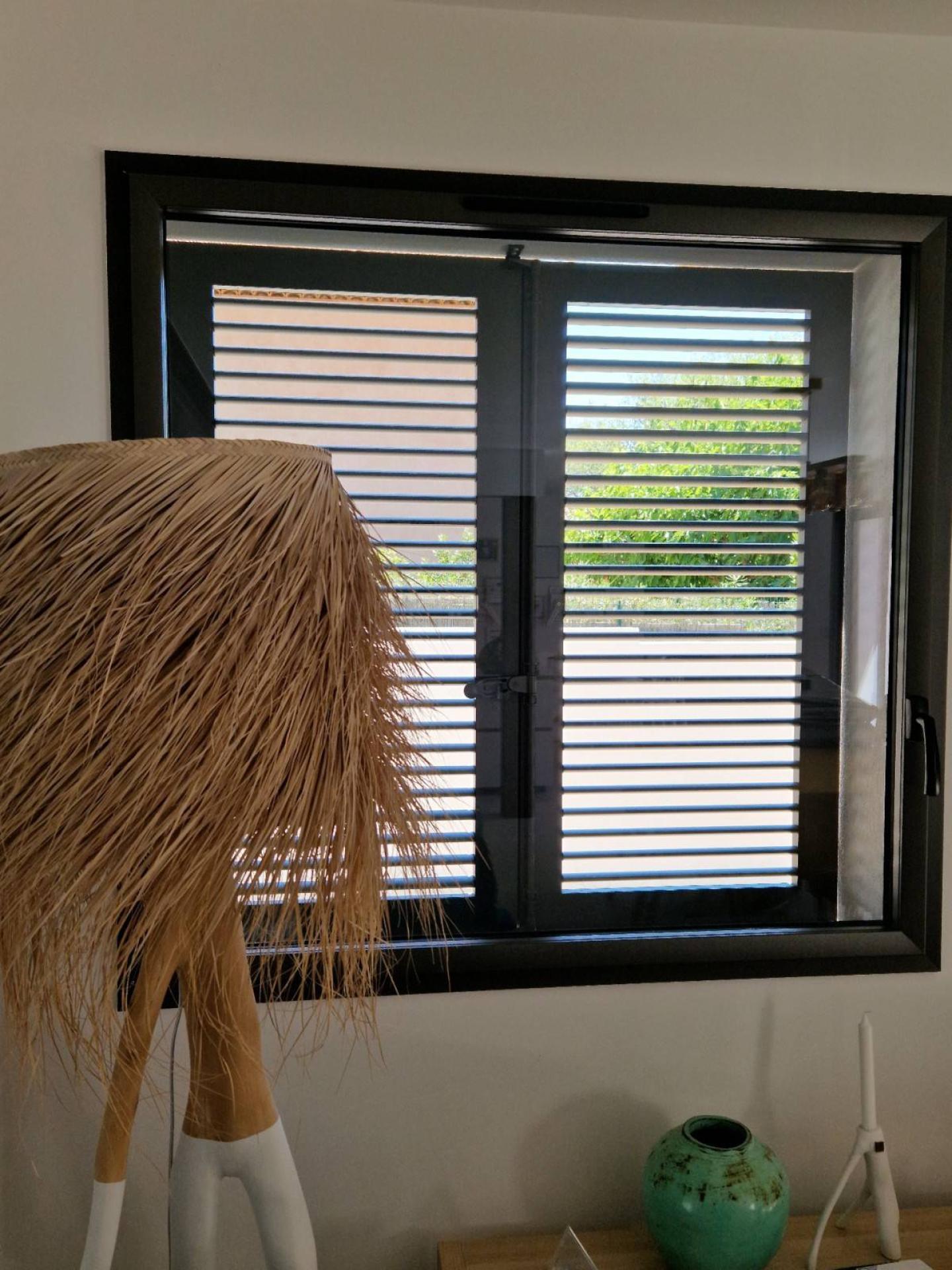Pour s’accorder au mieux avec cette maison, le modèle choisi est constitué de lames orientables extrudées, qui permettent de régler selon ses préférences la luminosité et l’aération.