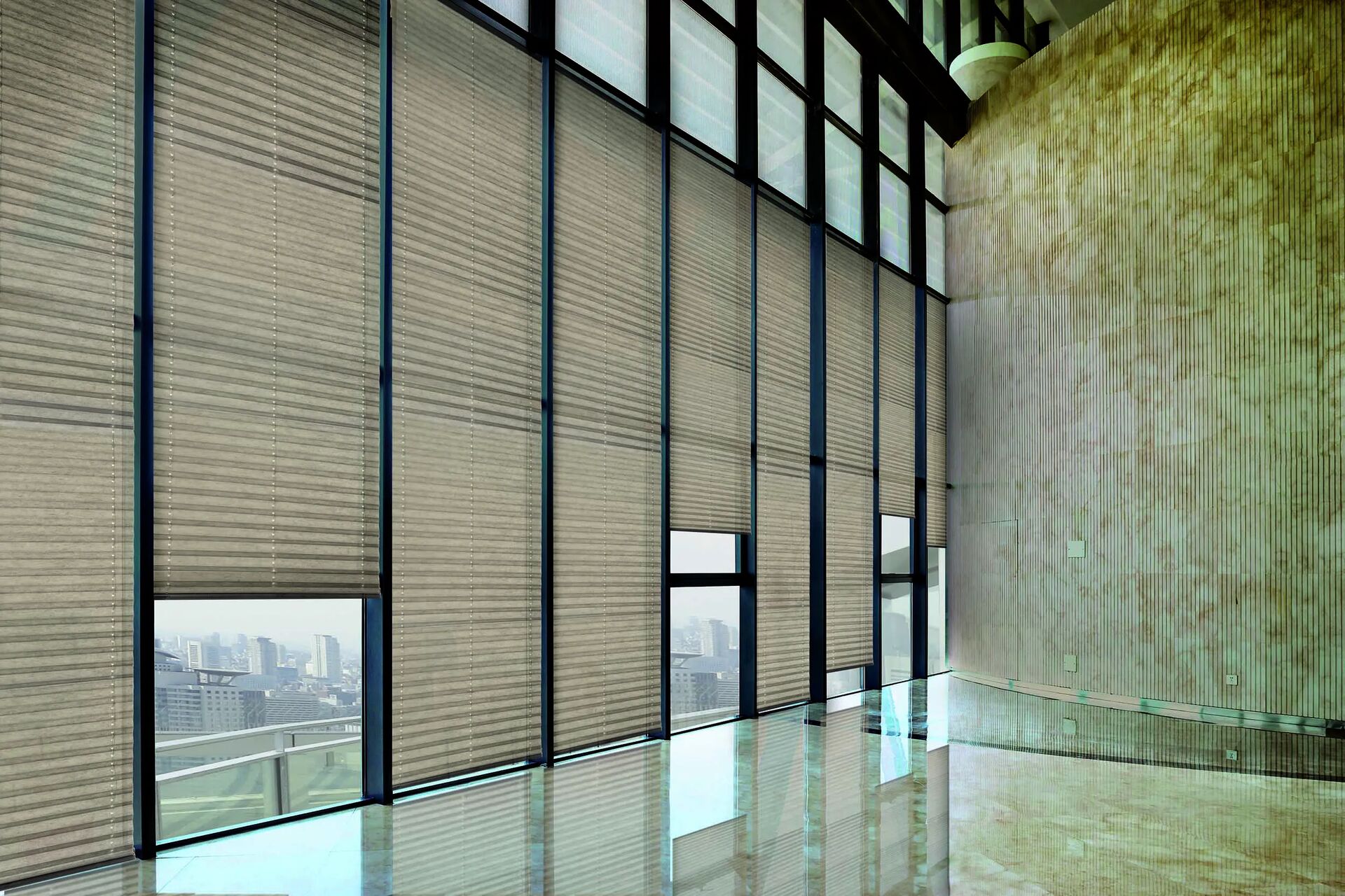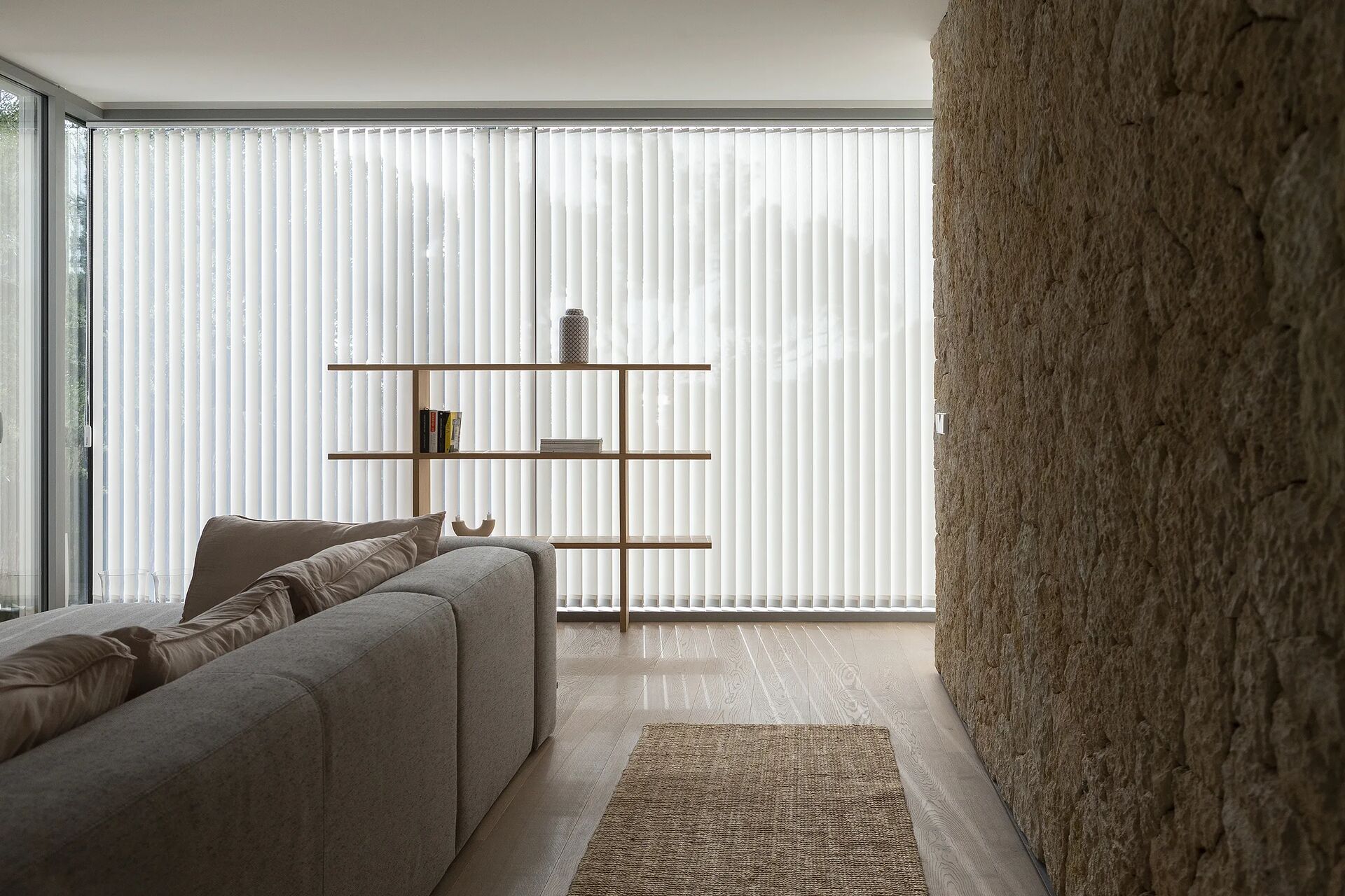 Store à bandes verticales : réglage précis de la lumière par orientation des lames jusqu’à 180°. Solution efficace pour grandes surfaces vitrées, rail adaptatif.