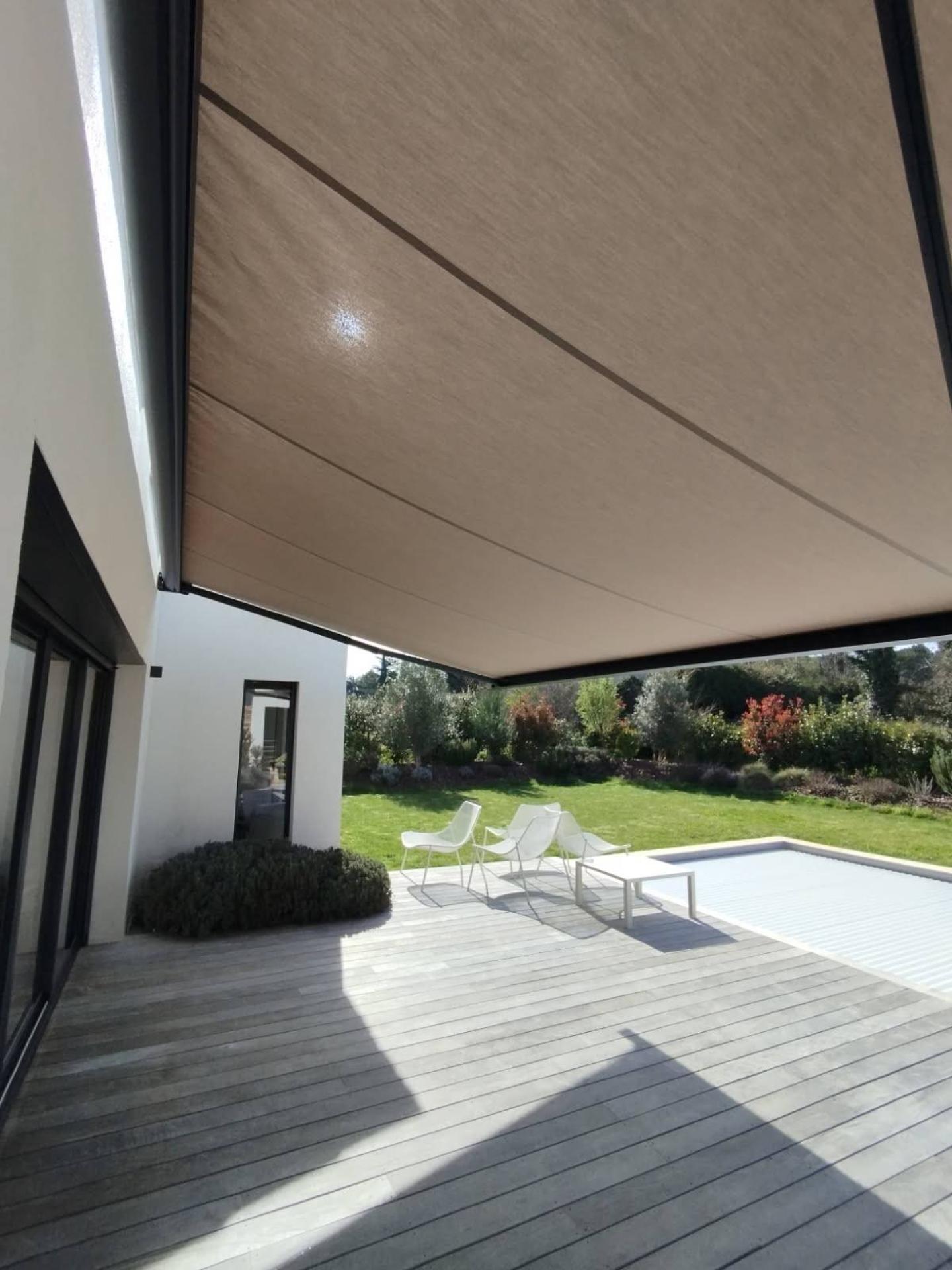 Pergola en aluminium, adossée ou autoportante, avec toile étanche rétractable : une protection solaire horizontale (sans inclinaison nécessaire pour l'écoulement de l'eau de pluie)